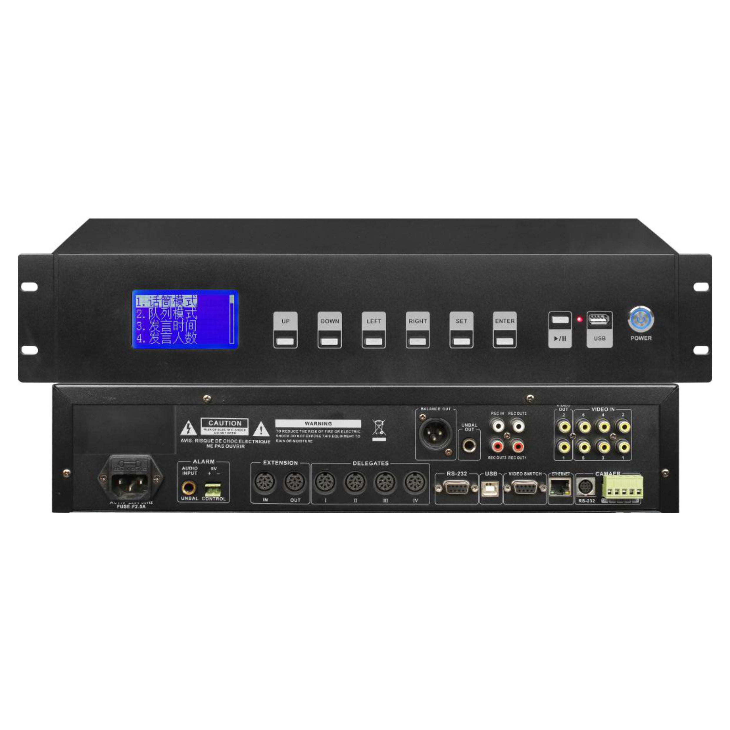 Four microphone connection, each support 30 units, can be connected to 120 units, 12 chairman units
