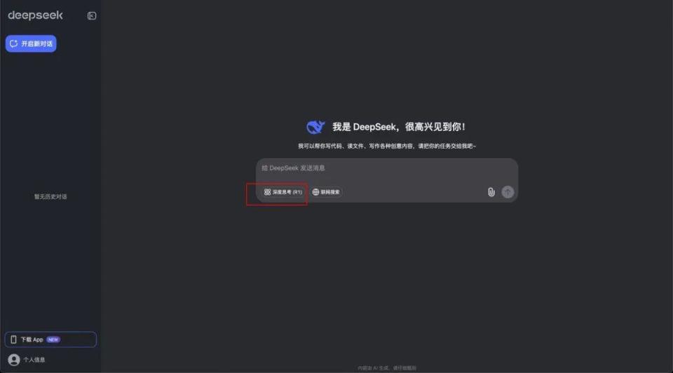 Web 端直接通過(guò)訪問(wèn)網(wǎng)址(https://chat.deepseek.com/)對(duì)話。在對(duì)話框的左下角位置,可以選擇是否開(kāi)啟 " 深度思考 " 模式。如果勾選,會(huì)使用 DeepSeek-R1 模型;如不勾選,則默認(rèn)使用 DeepSeek-V3 。
